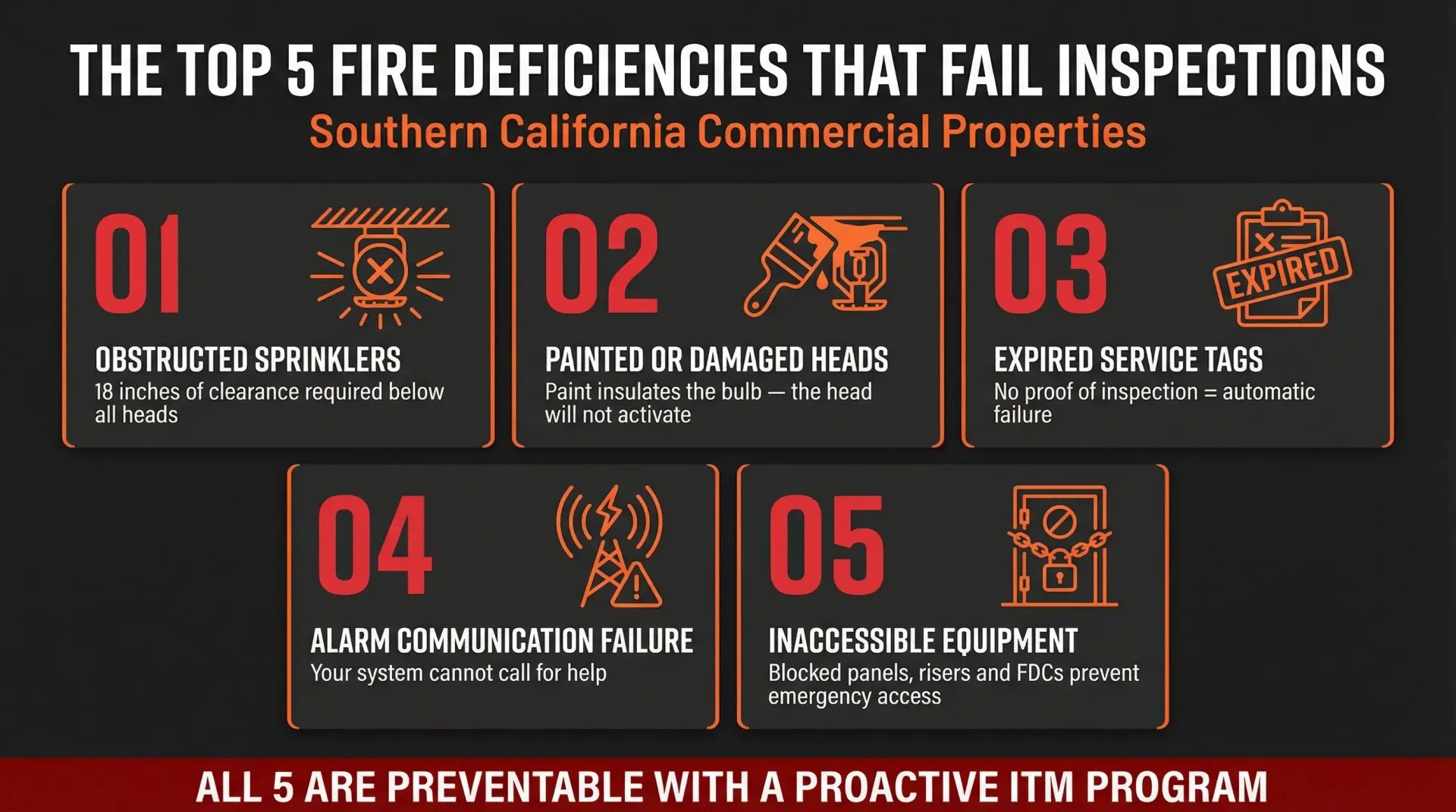 Blocked fire sprinkler heads and expired service tags are the two most common and easily preventable reasons for a failed inspection.